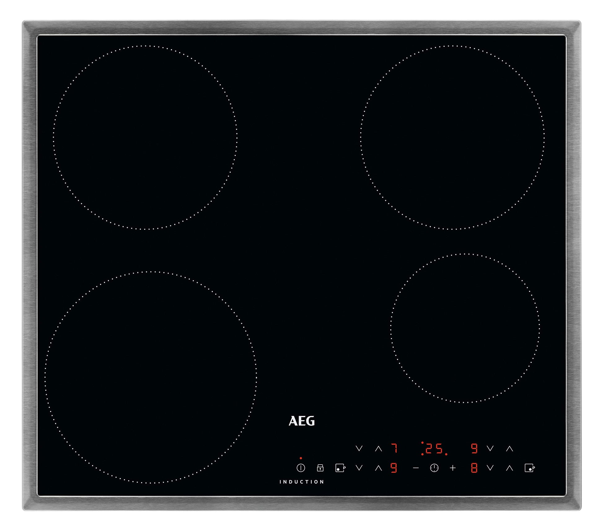 AEG indukcijas plīts virsma autonomā 60cm / 4 zonas ar 2x jaudas funkciju ātrai vārīšanai / 9 līmeņi / nerūsējošā tērauda rāmis / taimeris / skārienvadība / bērnu aizsardzība / atlikušās siltuma rādītājs / IKB6430AMB