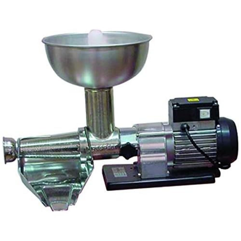 Tomātu spiede ar numuru 4, motors 220 V, jauda 0,4 ZS, korpuss un propellers no cinkota čuguna, piltuve Moplen, kolektors un filtrs no nerūsējošā tērauda, svars apmēram 11 kg.