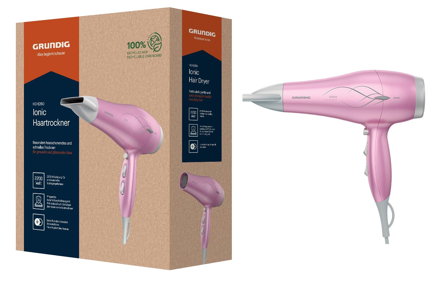 GRUNDIG HD 6280 matu fēns 2200 W, fēns, jonu funkcija, 3 temperatūras un 2 gaisa plūsmas līmeņi, aukstā līmeņa funkcija, keramikas pārklājums, ar rozā lotosa eļļu, 1,8 m kabelis, rozā/sudraba.