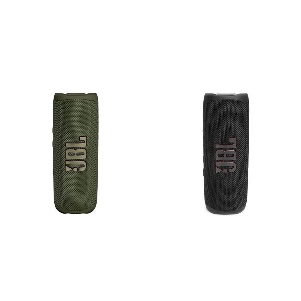 JBL Flip 6 Bluetooth kaste zaļā krāsā – ūdensizturīgs, portatīvs skaļrunis ar 2 ceļu skaļruņu sistēmu jaudīgam skaņai – līdz 12 stundām un Flip 6 Bluetooth kaste melnā krāsā