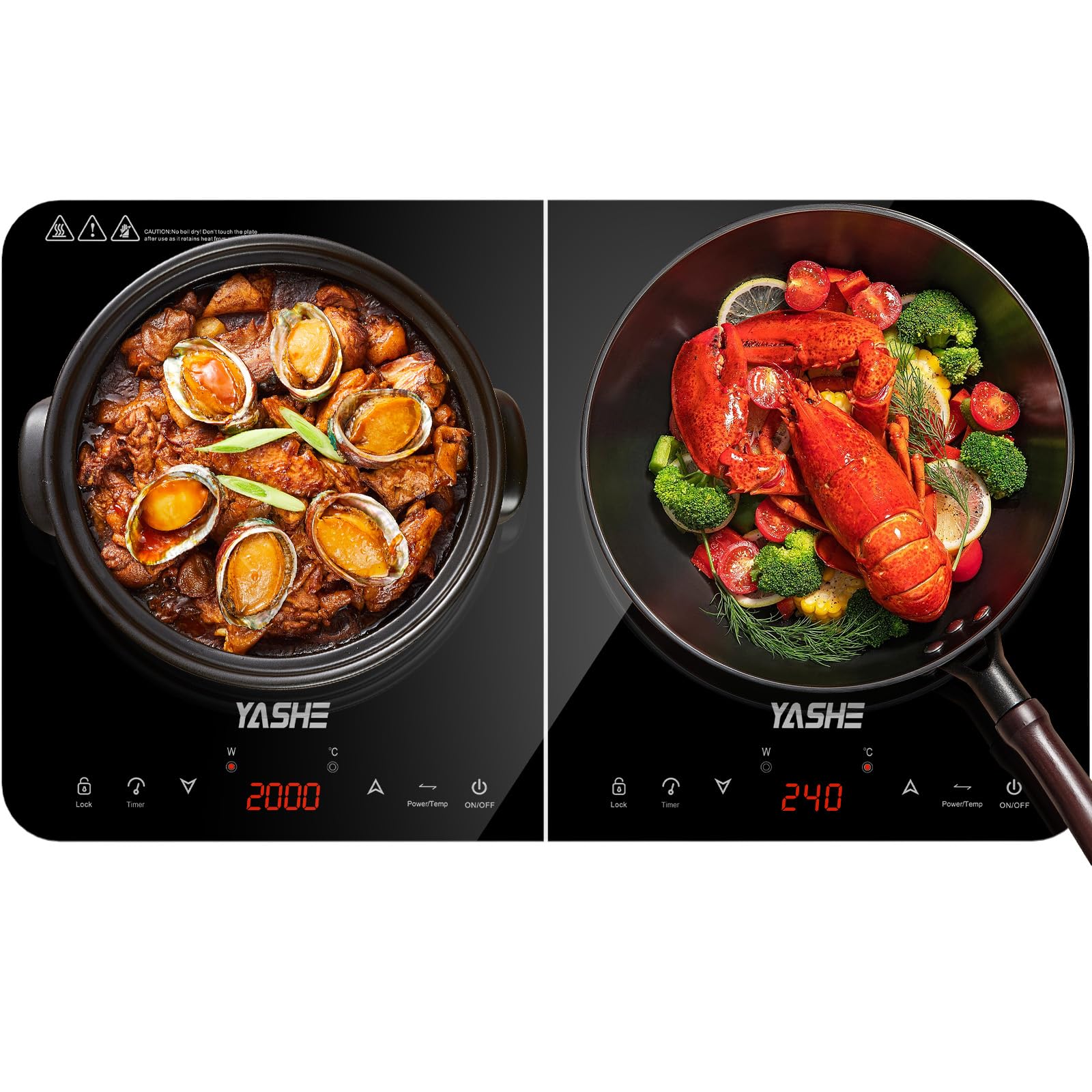 YASHE indukcijas plīts - divkāršā indukcijas plīts, 10 W jauda un 10 temperatūras līmeņi, 3500 W indukcijas plīts ar 2 plāksnēm, 4 stundu taimeris, bērnu drošības funkcija, stikla virsma, viegli tīrāma.