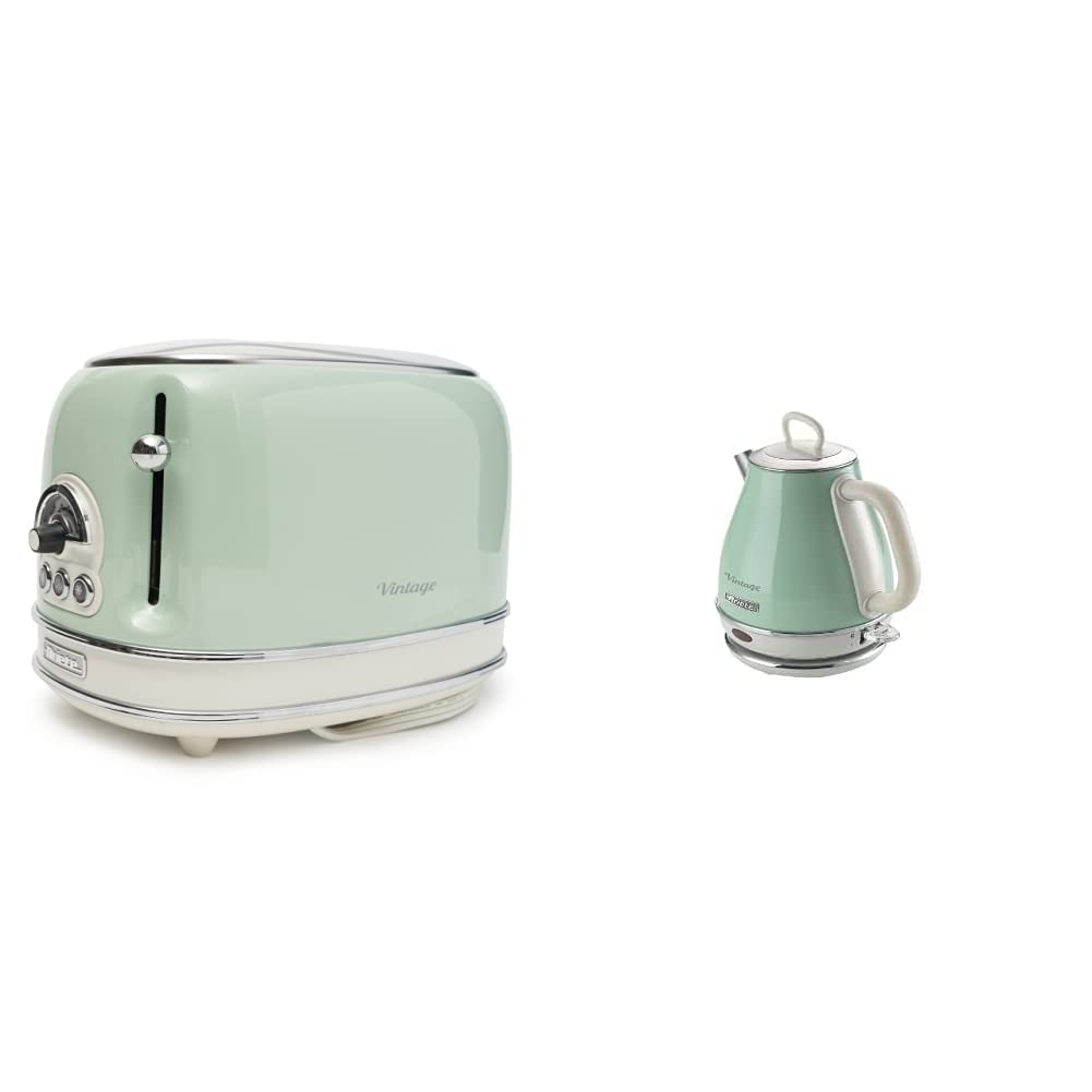 Ariete 155, dizaina tosteris 2 šķēlēm, ar knaiblēm, 6 tosta līmeņiem, 810 W, krēms/zaļš un 2868 Vintage, elektriskais dizaina tējkanna no nerūsējošā tērauda uz uzlējumiem, 1 litrs, 1600 W, zaļš