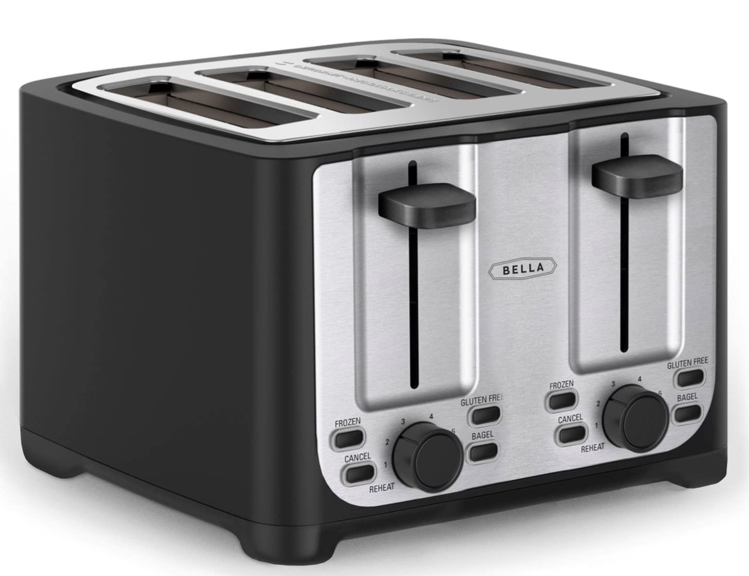 BELLA 4 šķēļu tosteris ar automātisko izslēgšanos, papildu platuma atverēm un noņemamu drupaču atvilktni, kā arī pārtraukšanas, atkausēšanas un uzsildīšanas funkciju, nerūsējošais tērauds un melns.
