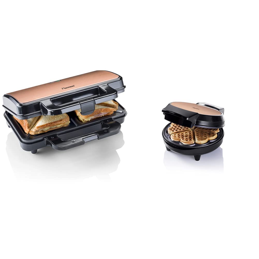 Bestron ASM90XLCO XL sviestmaizes cepeškrāsns, divām sviestmaizēm, 900W, melns/vara un vafeļu cepeškrāsns klasiskām sirds vafelēm, vafeļu automāts ar nelipīgu pārklājumu, iekļauti receptes ieteikumi, 700W, vara