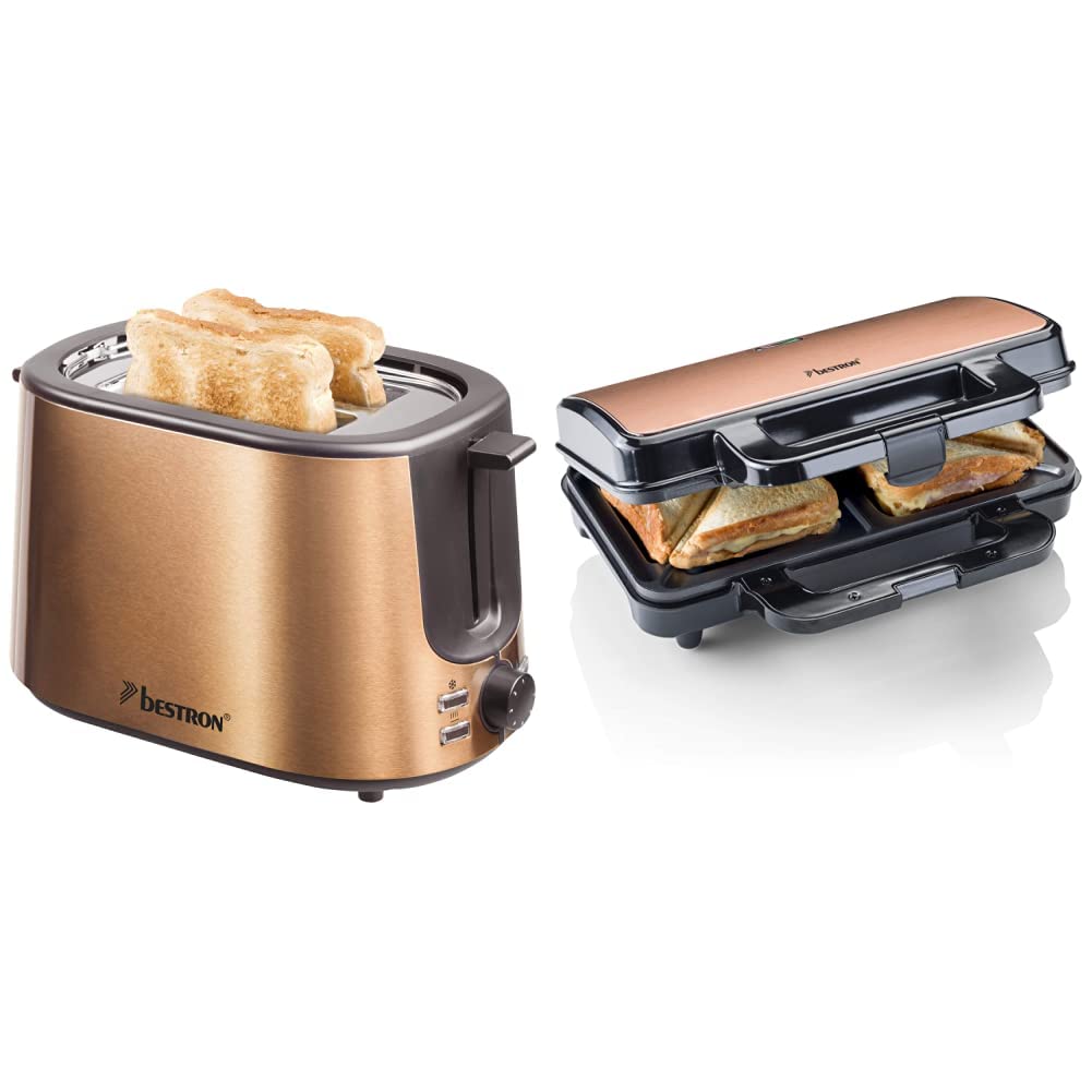 Bestron tosteris ar 2 grauzdēšanas kamerām, 1.000 W, nerūsējošais tērauds ar vara izskatu un ASM90XLCO XL sviestmaizes cepeškrāsni, ar nelipīgu pārklājumu, paredzēts 2 sviestmaizēm, 900 vati, melns/vara, metāls.