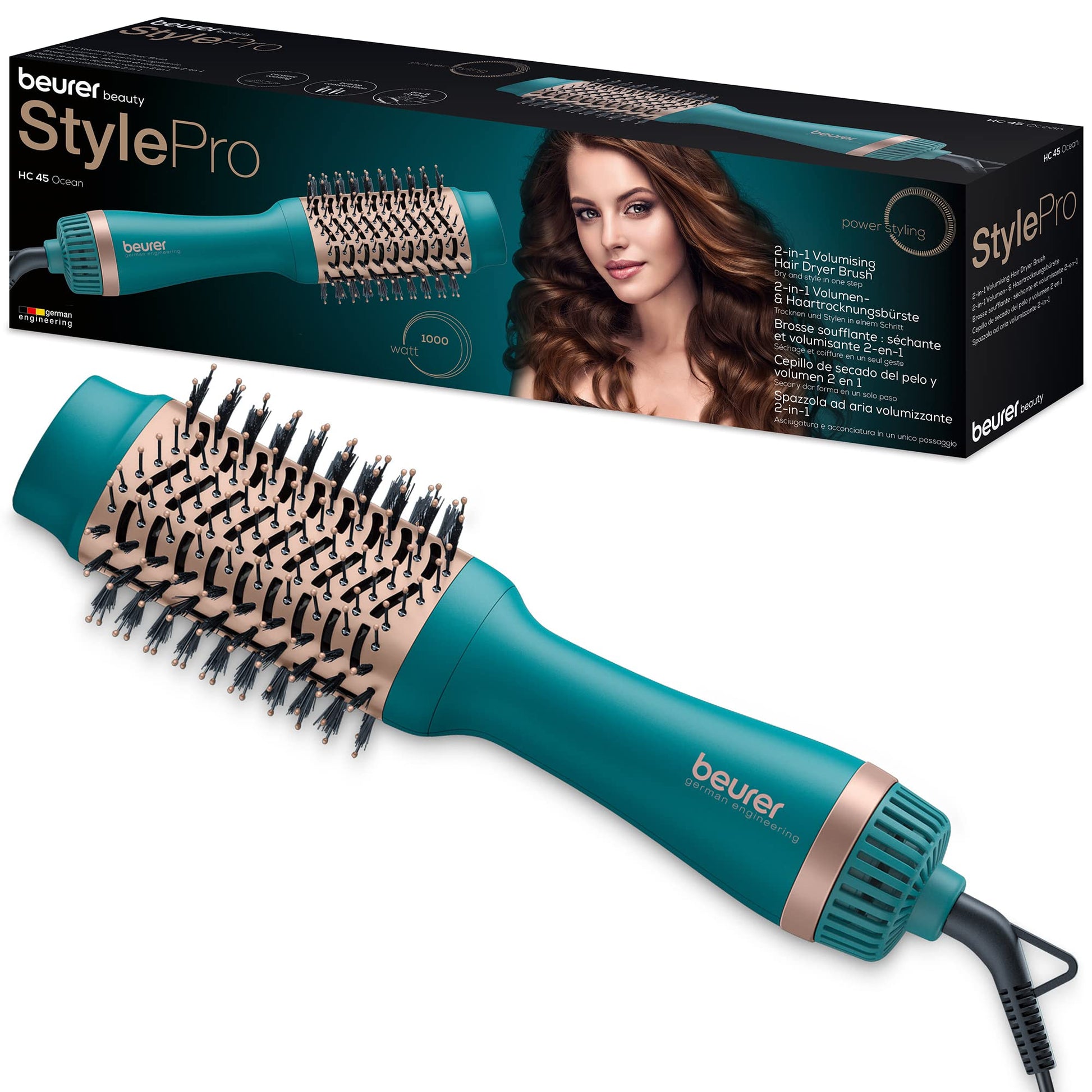 Beurer HC 45 Ocean apjoma un matu žāvēšanas suka ļauj jums žāvēt un stilizēt matus tikai vienā solī. Suku kombinācija maigi un saudzīgi izķemmē matus. Keramikas-keratīna pārklājums aizsargā jūsu matus, turklāt varat izvēlēties no 2 sildīšanas un ventilatora līmeņiem, kā arī aukstā gaisa līmeņa. Iebūvētā jonu funkcija nodrošina gludus un spīdīgus matus.