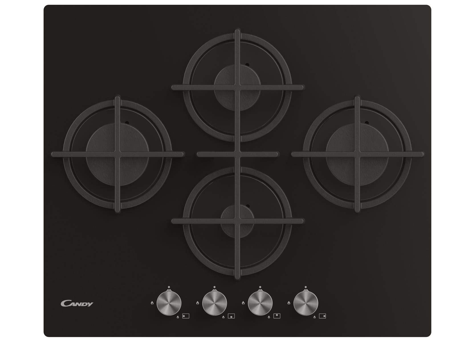 Candy CVG6DPB gāzes plīts no cietināta stikla, 4 degļi, iebūvēts grils, čuguns, drošības vārsts, LPG un metāns, 60 x 51 x 95 cm, melns