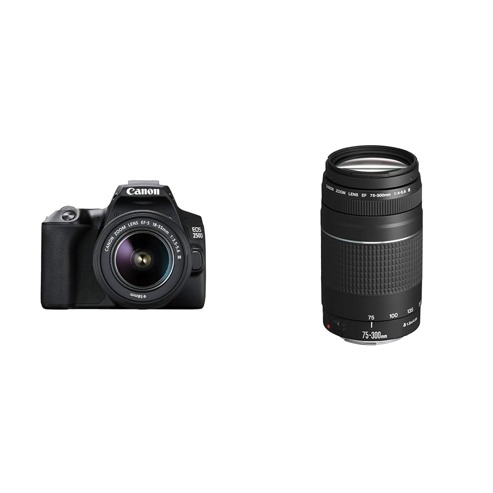Canon EOS 250D digitālā kamera - ar objektīvu EF-S 18-55mm F4-5.6 is STM un EF 75-300mm F4.0-5.6 III tālummaiņas objektīvs (58mm filtra vītne) melns