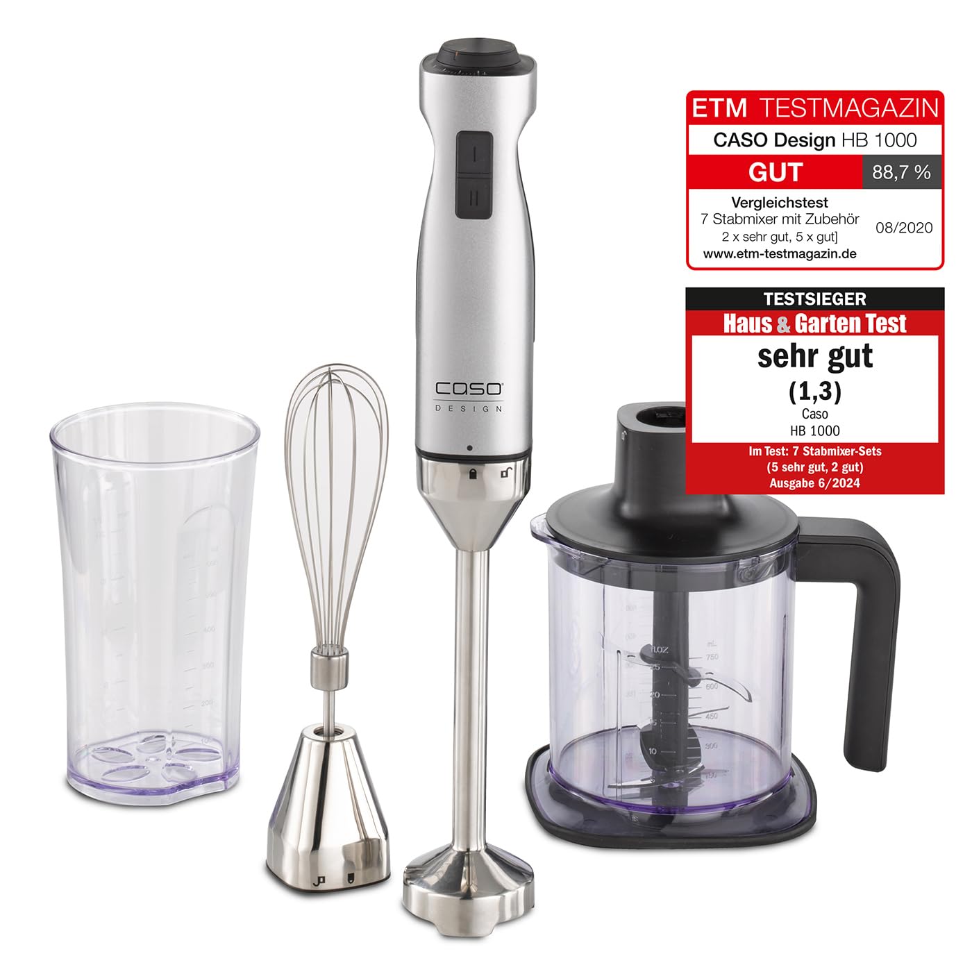 Caso HB 1000 dizaina rokas mikseris ar biezeni, testu uzvarētājs: Māja un dārzs tests, putotājs, mērkrūze un trauks, 1000 vati, alumīnijs, sudrabs, melns