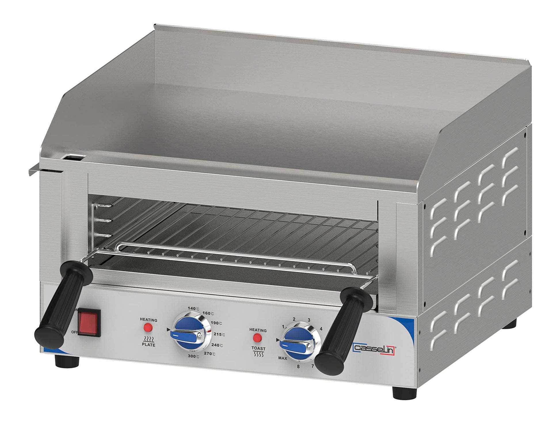 • Nerūsējošā tērauda konstrukcija • Masīva tērauda plāksne • Ieslēgšanas/izslēgšanas slēdzis • 2 sildlampas • Uzkodu plāksne 2500 W • Termostats regulējams no 140 °C līdz 300 °C • Toasters 1100 W • 8 regulējamas temperatūras pakāpes • 2 drošības termostati • Tauku savākšanas trauks • Vārīšanas plāksne: 515 vārīšana x 340 mm • Jauda: 3600 W/230 V • Izmēri: Garums 519 x Platums 592 x Augstums 354 mm • Svars: 29 kg