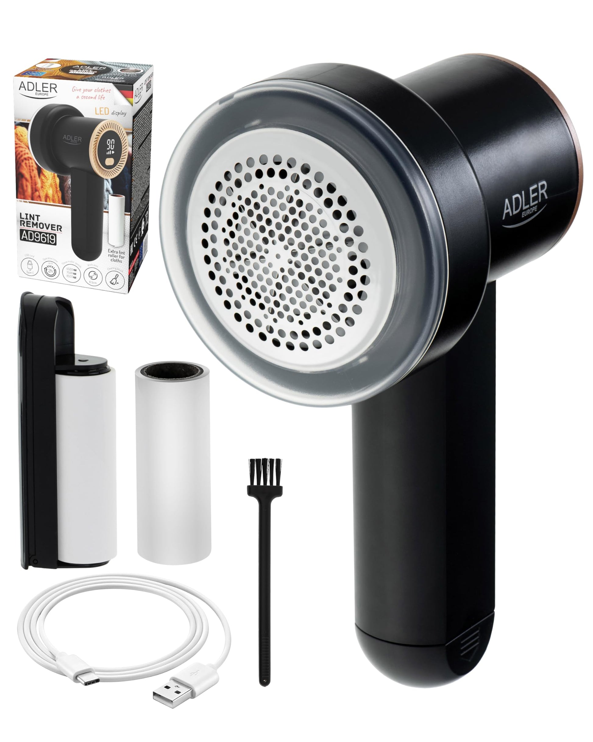 Elektriskais vilnas noņēmējs ADLER EUROPE - vilnas noņemšana no apģērba un audumiem - regulējama 3 ātrumu iestatīšana - 6 asmeņu asmens - LED displejs - USB uzlāde, tīrīšanas rullis