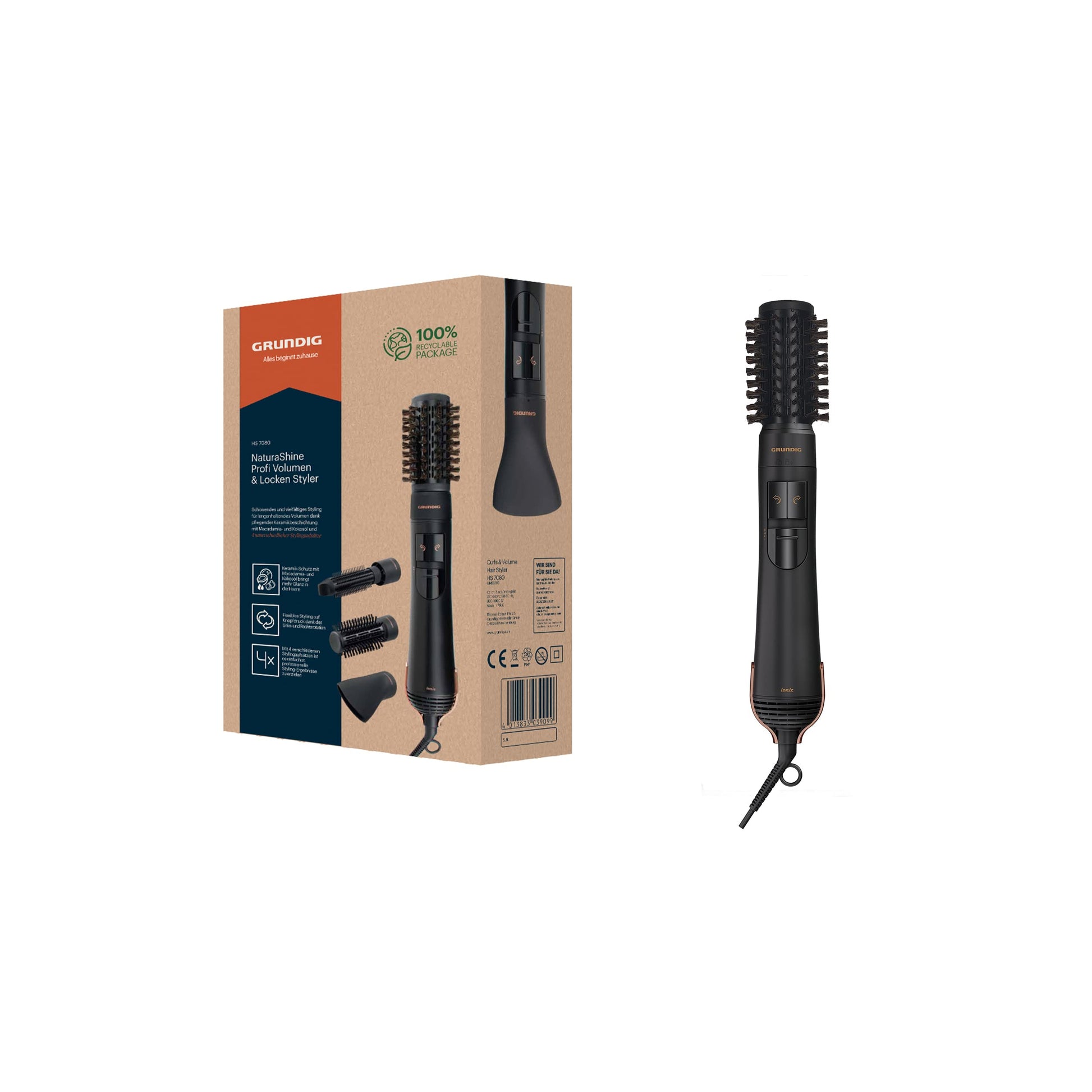 GRUNDIG NaturaShine HS 7080 apjoma un cirtas veidotājs, termobirste ar 2 temperatūras un gaisa plūsmas līmeņiem, jonu funkcija, 1000 vati, kreisā un labā rotācija, 4 stila uzgaļi, melns/rozā zelta.
