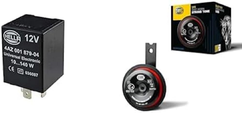 HELLA 4AZ 001 879-041 Blinkeru regulators - 12V - 3-polu - Uzstādīšana - ar turētāju & 3AL 922 000-951 Signāla svilpe - S90-12V - 113dB(A) - Frekvenču diapazons: 350Hz - Zems tonis - Korpusa krāsa: sarkana/melna - Plakanā spraudņa pieslēgums