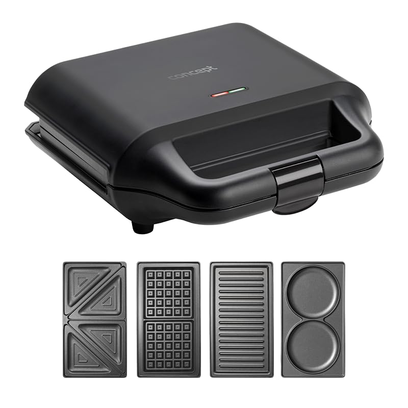 Multifunkcionālais 4 in 1 tosteris Concept SV3055 ir aprīkots ar četriem pāriem maināmu plākšņu (toasts, vafeles, grils, pankūkas). Jūs saņemat četrus praktiskus palīgus vienā korpusā, kas jūsu virtuvē aizņem tikai minimālu vietu. Jūs varat plāksnes ievietot trauku mazgājamajā mašīnā. Tehniskie parametri: 4 komplekti maināmu plākšņu – tosteris, vafeļu cepeškrāsns, grils, cepamā panna Efektīva matēta virsma Signāllampa (sarkana gaisma) Sildīšanas lampa (zaļa gaisma) Automātiska temperatūras regulēšana Droša aukstā rokturis Nepiedegoša virsma Ļoti viegli kopjama – plāksnes var mazgāt trauku mazgājamajā mašīnā Melna krāsa Enerģijas patēriņš: 700 W Spriegums: 220 – 240 V Izmērs: 23 x 23,5 x 9,7 cm