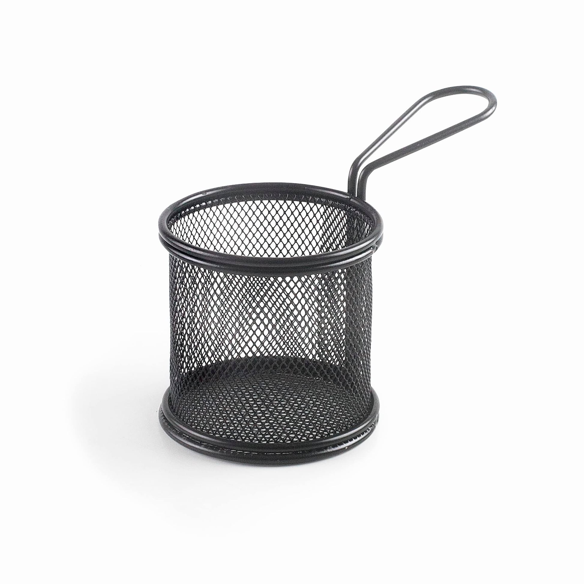 Melnā apaļā grozā no augstas kvalitātes nerūsējošā tērauda. Tas ir pārklāts ar matētu melnu krāsu. Elegants un oriģināls veids, kā pasniegt visdažādākos uzkodas un tapas bāros, kafejnīcās, restorānos vai ēdināšanā. Tas ļauj novietot pārtiku uz absorbējošas papīra vai tieši uz groza. Tas nav paredzēts cepšanai. Tā izmēri ir šādi: 9 cm / 8 cm (h).