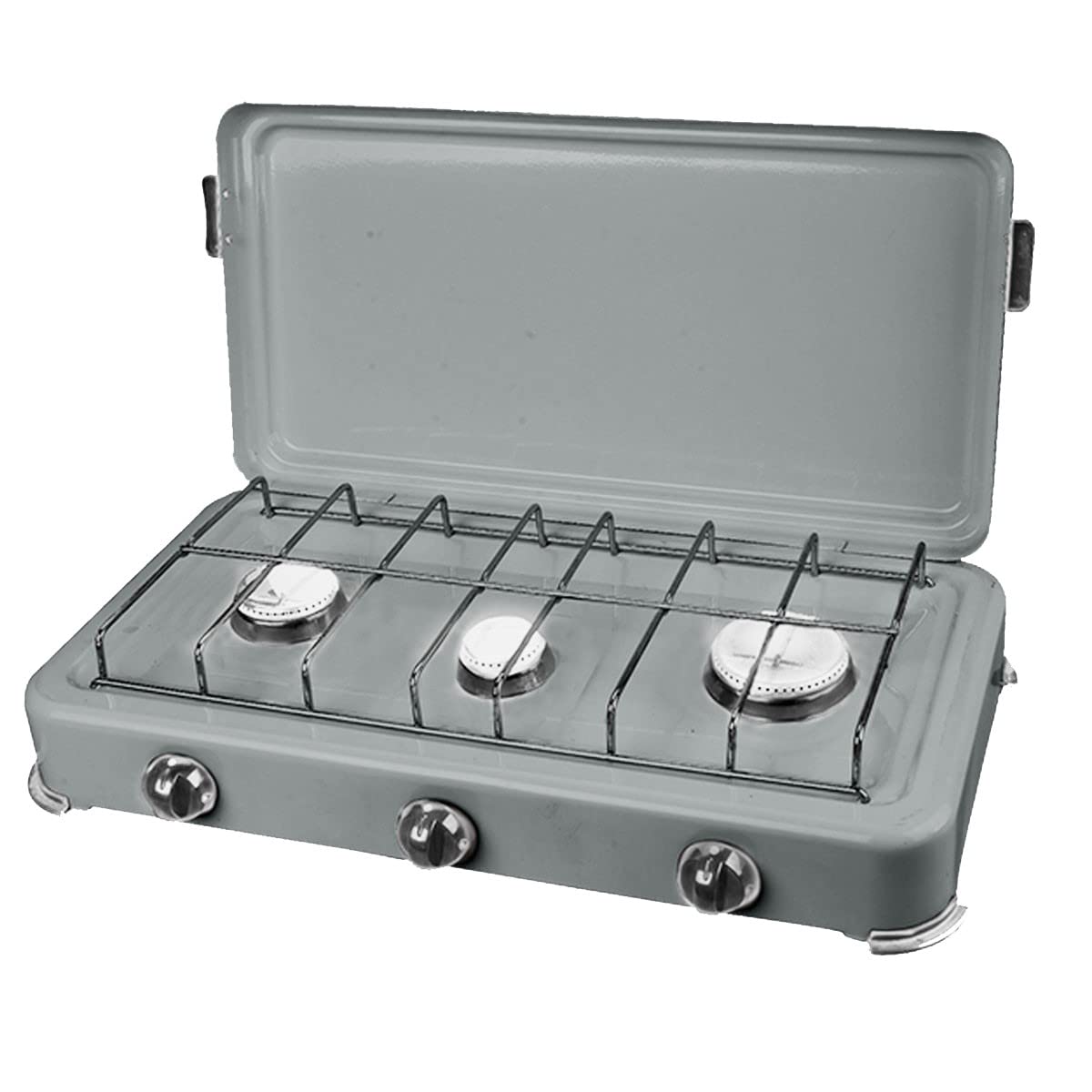 Pārnēsājams gāzes plīts, 3 plīts virsmas, 3000 W, sudraba, 3 butāns/propāns, nerūsējošā tērauda vāks