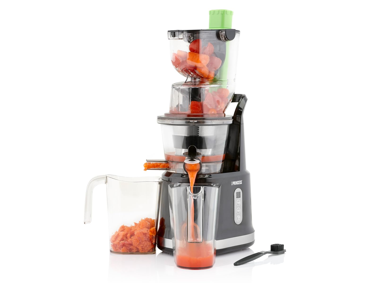 Iemesli, kāpēc izvēlēties Princess Easy Fill sulu spiedes: Pateicoties unikālajam, ekstra lielajam pildīšanas caurulei, jūs varat ievietot veselas ābolus vai tomātus. Jaudīgais motors rada lēnas košļāšanas rotācijas, caur kurām tiek iegūta vairāk sulu nekā parastajā sulu spiedē. Vertikāla koniska vārpsta un siets, lai pēc iespējas labāk saglabātu visas uzturvielas, vitamīnus un aromātus. Ideāli piemērots veselīgam dzīvesveidam ar svaigām augļu un dārzeņu sulām vai veselīgu zupu pagatavošanai. Pateicoties mazgājamām daļām, viegli tīrāms.
