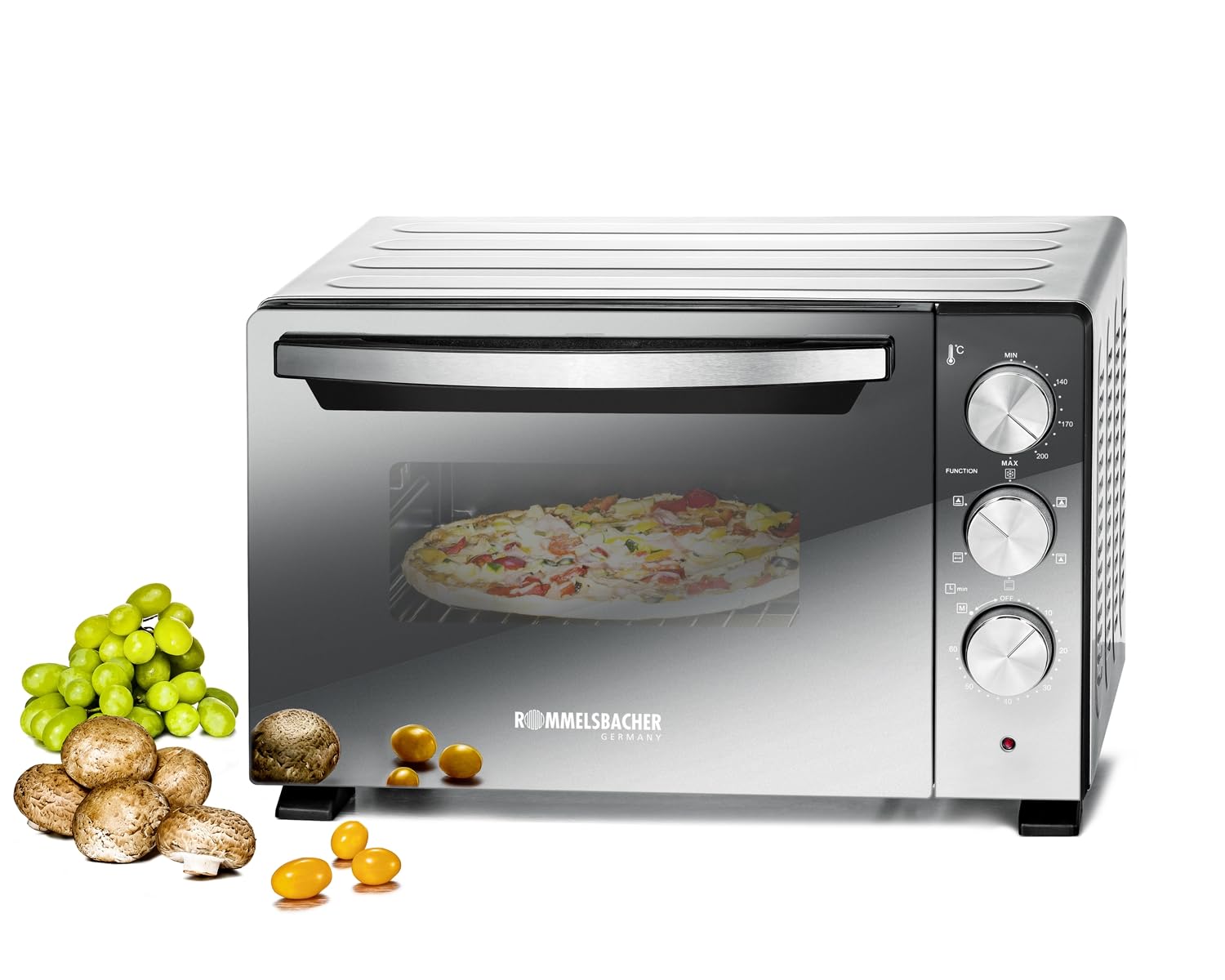 ROMMELSBACHER Cepeškrāsns un grils BGS 1400 - energoefektīvs un efektīvs, 22 litru tilpums, ar nelipīgu cepeškrāsns virsmu, 6 sildīšanas veidi, grilēšanas spit, 60 minūšu taimeris, dubultā stiklošana, sudraba, 1380 W